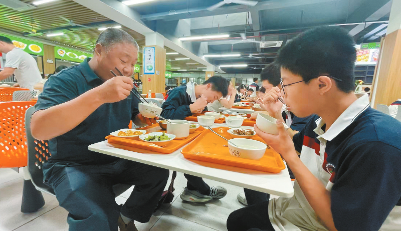 12点午餐时间,千名学生井然有序地排队领饭、用餐。餐厅中间的一张餐桌上,50多岁的副校长张忠端着餐盘,与学生一同用餐,与学生谈论菜品(大图)。他介绍,他分管食品安全工作,学校对食堂的环境卫生、食材采购、加工、留样及餐具消毒等环节都进行严格把控。他每餐都与学生一起用餐,体验饭菜质量与口味,了解师生对饭菜的喜好。高一学生吕顺臻感慨地说:“学校领导和我们吃一样的饭菜,关心我们的食品安全和喜好,让我们感觉特别放心、暖心。”