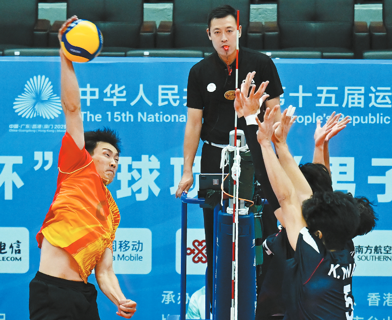 11月12日,福建队球员季道帅(左)在比赛中进攻。当日,在江门进行的第十五届全国运动会排球男子成年组小组赛A组比赛中,福建队3比0战胜香港队。 新华社记者 李鑫 摄