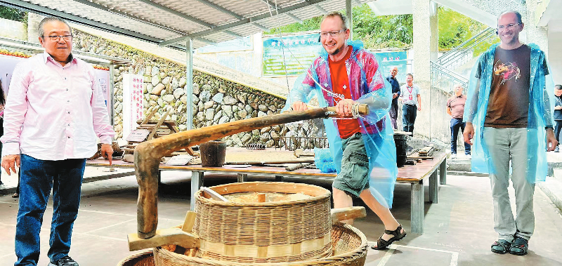 日前,永定区大溪乡文史馆在侨光中学正式揭牌。该馆由大溪乡贤、知名企业家游道生、游旺生兄弟捐资200余万元兴建,占地面积超过1000平方米,承载着大溪千年客家文明与百年红色记忆,也成为连接海内外5万大溪华侨的寻根纽带,揭牌当日60多名瑞士日内瓦州的客人慕名而来。馆内展陈以“地、史、人、文”为经纬,包括“地灵人杰”展区、“红色记忆”展区、“侨星闪耀”展区和特别设立的“知青情缘”展厅,织就地方文化全景图。图为瑞士日内瓦州游客现场体验大溪农耕文化。 通讯员 熊川 摄