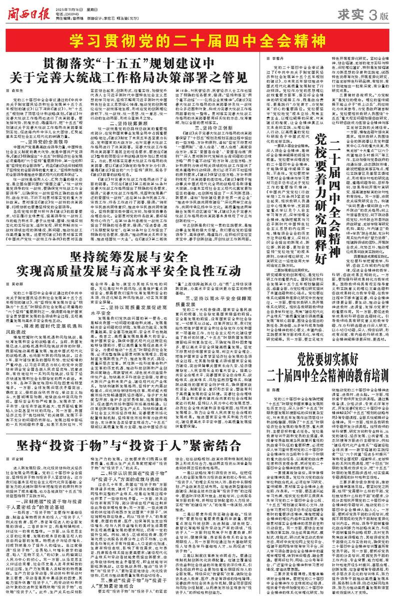 进入新发展阶段,优化投资结构攸关经济社会发展全局质量。党的二十届四中全会提出,坚持投资于物与投资于人紧密结合。这为我们在基本实现社会主义现代化夯实基础、全面发力的关键时期科学把准投资的原则和方向提供了根本遵循,也为各地谋划“十五五”投资蓝图指明了实践方向。
