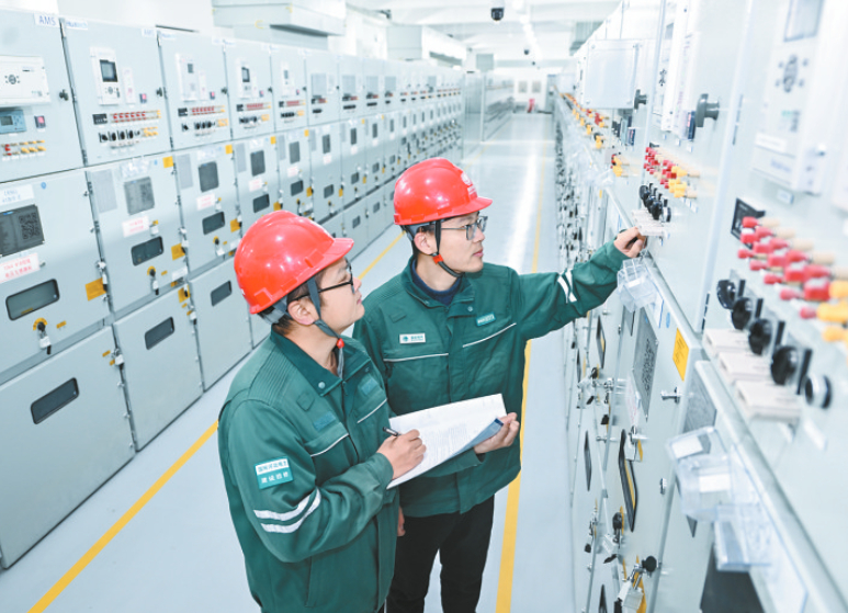 11月19日,工作人员在容西1号变电站内巡检。当日,雄安新区容西片区首座220千伏变电站——容西1号变电站正式建成投运。该变电站是雄安500千伏变电站下送至起步区电力大动脉的枢纽节点。新华社记者 牟宇 摄
