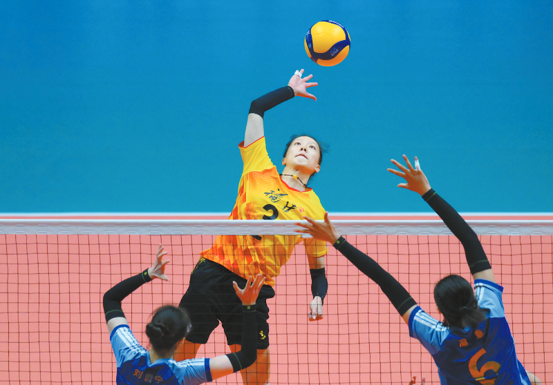 11月19日,福建队球员郑益昕(中)在比赛中。当日,在澳门进行的第十五届全国运动会排球女子成年组3-4名决赛中,福建队3比2胜上海队,获得季军。 新华社发 张金加 摄