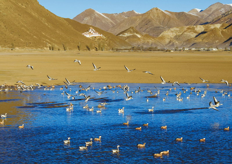 这是11月23日在西藏拉萨市林周县拍摄的越冬候鸟(无人机照片)。冬日时节,拉萨市林周县迎来大批越冬候鸟,黑颈鹤、斑头雁、赤麻鸭等候鸟在河谷、湖泊等地觅食、休憩。 新华社记者 姜帆 摄