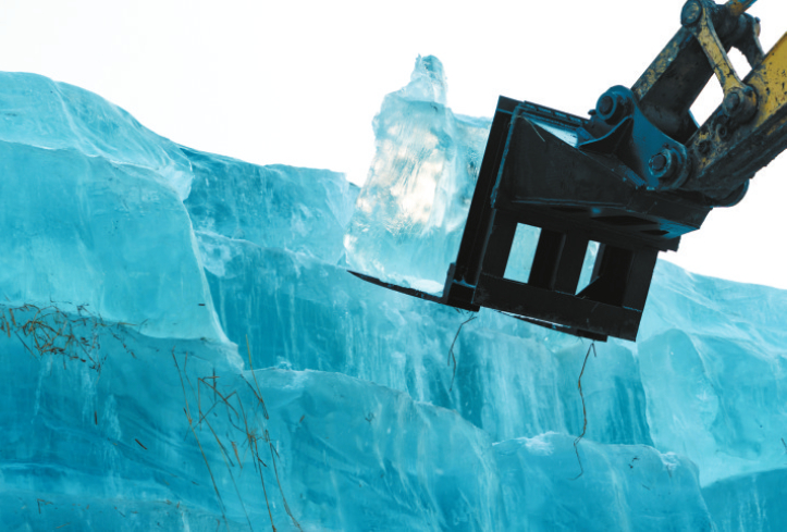 11月24日,在哈尔滨冰雪大世界存冰场,工程车辆从冰垛上取冰。当日,第二十七届哈尔滨冰雪大世界存冰启用,园区冰建建设将于11月25日正式开工。新华社记者 谢剑飞 摄
