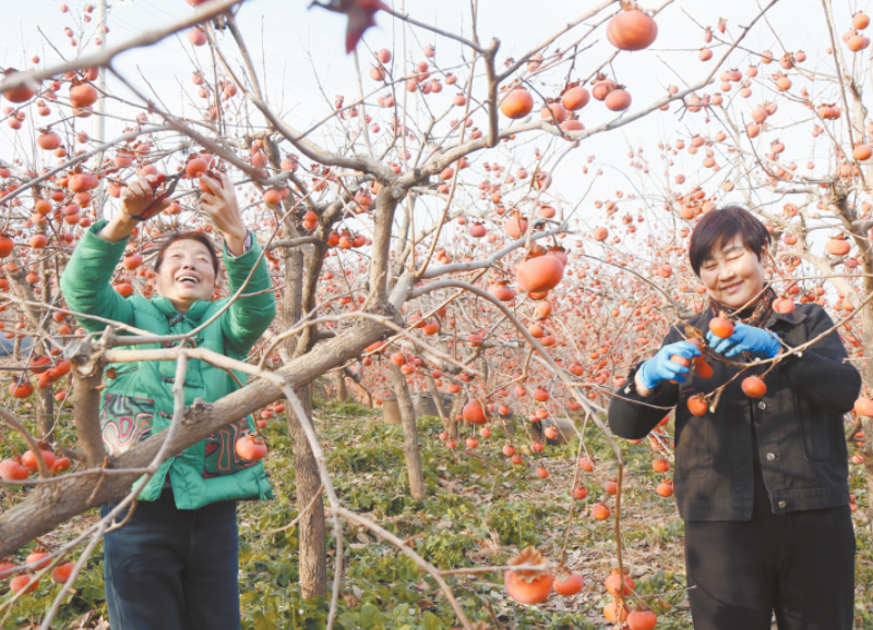 12月7日,在河南省洛阳市汝阳县三屯镇耿沟村温馨种植专业合作社,果农在采摘柿子。当日是大雪节气,各地农民抢抓农时,有序开展冬季农业生产。新华社发 康红军 摄
