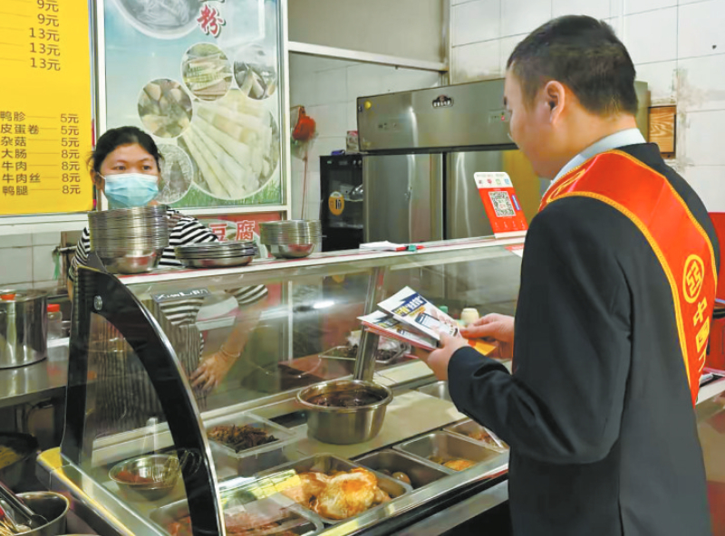 该行员工身着正装、佩戴“中国工商银行”红色绶带,携带宣传资料走进沿街餐饮店及社区小店,面向商户经营者讲解宪法基本原则和公民权利义务相关内容。在一家小吃店内,工作人员耐心向店主介绍宪法对个体经济主体合法权益的保障作用,并结合日常经营场景,普及反洗钱、防范电信诈骗等金融法律知识。在另一处交流现场,工作人员与商户代表围绕依法合规经营、消费者权益保护等话题展开互动,现场气氛热烈。