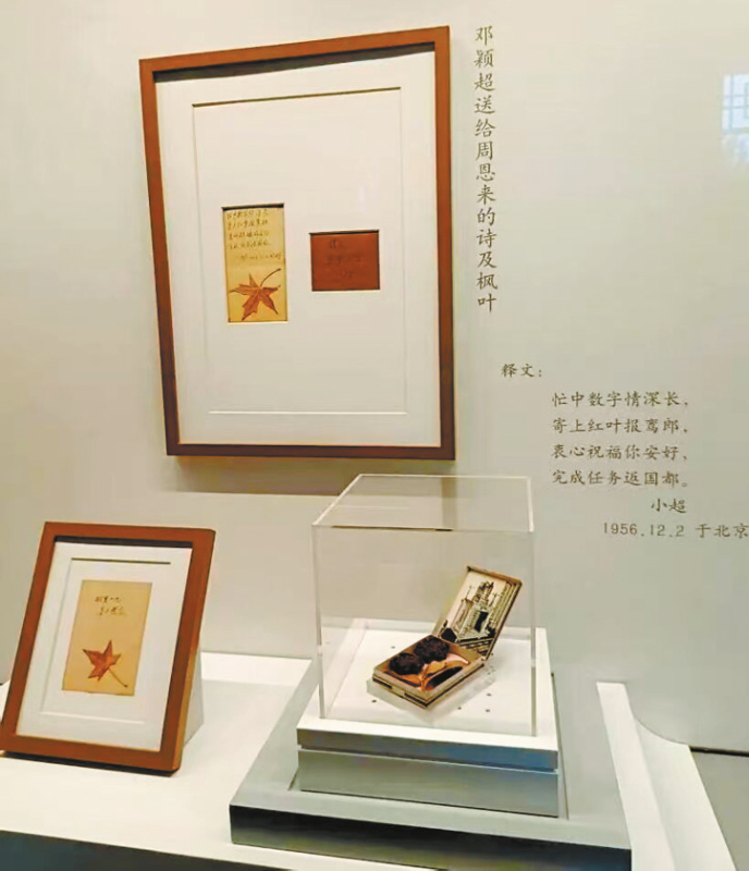 展厅在此转为幽深。尘埃在斜射的光柱里缓慢浮沉。我停在一只展柜前,目光被一片薄如蝉翼的枫叶所牵系。这片枫叶标本,叶脉已被岁月压出淡金纹路。讲解员的声音轻轻响起:“1954年,日内瓦会议进入最紧张阶段,周恩来连续几日睡眠不足四小时。此时的北京,邓颖超同志同样在政务中繁忙奔走。庭院里海棠正盛,她剪下一枝,与压好的红叶同装信封,在纸片上简单写道:‘红叶一片,寄上想念’,托人带往万里之外的瑞士......”周恩来收到这来自故土的思念,随后,将一枝压好的日内瓦芍药花,委托信使带回国内。