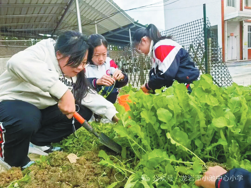 “这是我们亲手种的有机蔬菜,快来买哦!”在新罗区小池镇热闹的集市上,一群穿着校服的“红领巾摊主”格外引人注目,他们举着色彩鲜艳的手绘展板,热情地向路人介绍蔬菜,将校园劳动基地的收获,变成了传递温暖的善意。这场“从菜园到市集”的爱心义卖,正是小池中心小学劳动教育项目化实践的生动缩影。