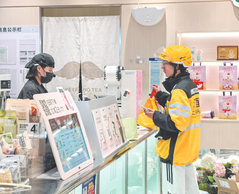 外卖员在奶茶店内与店员进行交接。随着奶茶经济发展,奶茶外卖接单不断。