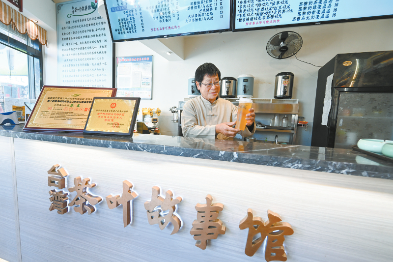 当地小有名气的“台湾茶叶故事馆”,更是两岸融合发展的成功典范。2006年,台商曾国宝跨越海峡来到漳平永福,扎根这片沃土种植高山茶。2022年,他顺势在永福开出这家奶茶店,以自家茶园的茶叶为茶底,打造出兼具两岸风味的特色饮品,还配套推出台湾面食、速食小吃等创新单品,开业之初一度火爆到“门都被挤爆”。“那时候全镇才3家奶茶店,我们一开门就客流不断。”曾国宝笑着回忆道。