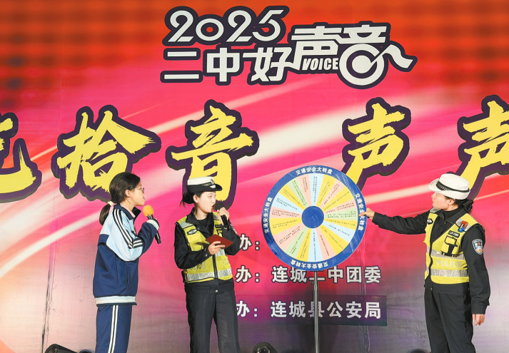 19日,连城县第二中学“好声音”歌唱比赛激情开唱。连城县公安局交管大队巧借这一宣传契机,在赛场间隙开展“交通安全大转盘”有奖问答活动,互动传播安全“金种子”,将交通安全知识送给师生。(通讯员 张菡珏 吴如纯)