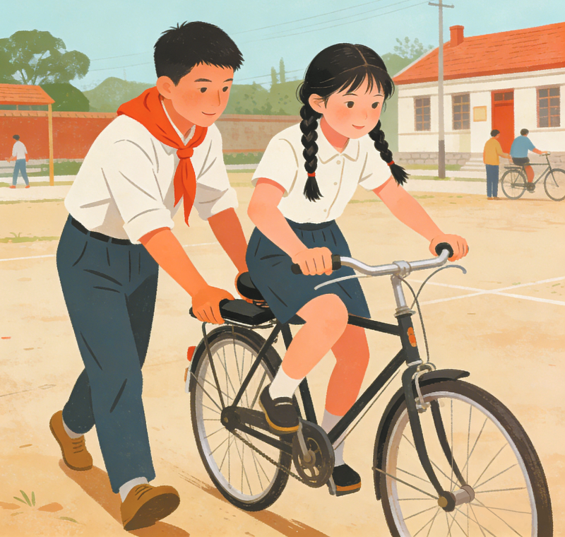 学骑车渐成一种时尚,无车族也不甘落后。在晒谷坪、公路、机耕路等开阔地带,师父耐心地言传身教,时而抓牢车把或车后架以把握平衡,时而拖住车身帮刹车,时而助推前行并偷偷地放手......学徒谦虚请教,一板一眼,手忙脚乱。有时,突然会传来车倒地的撞击声或欢笑声、呵斥声。
