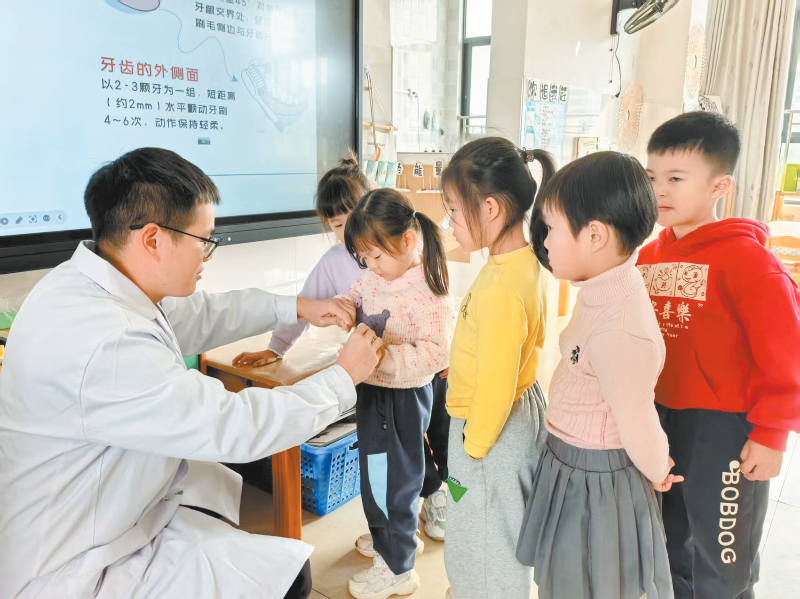 近日,武平县文山幼儿园开展“家长助教日”活动,搭建家校共育新平台。家长们化身“教师”走进班级,充分发挥自身优势带来多元课程。图为医生家长用浅显语言科普卫生知识,助力幼儿树立健康意识。 通讯员 钟莲瑛 摄