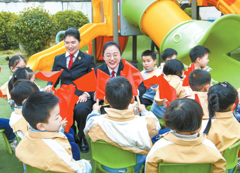 日前,连城县人民法院受邀参加县林坊中心幼儿园的校园开放日活动,法官在游戏中普及儿童安全、反诈禁毒等法律知识,筑牢成长的法治防线。(通讯员 李玲)