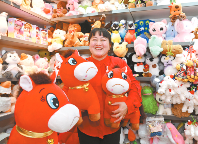 1月12日,在浙江义乌市国际商贸城一区玩具销售区,市场经营户“开心姐妹”负责人张火清展示销售的“哭哭马”小马公仔玩具。这款玩具在网络上意外走红,成为新年以来义乌市场的爆款产品。新华社发 吕斌 摄
