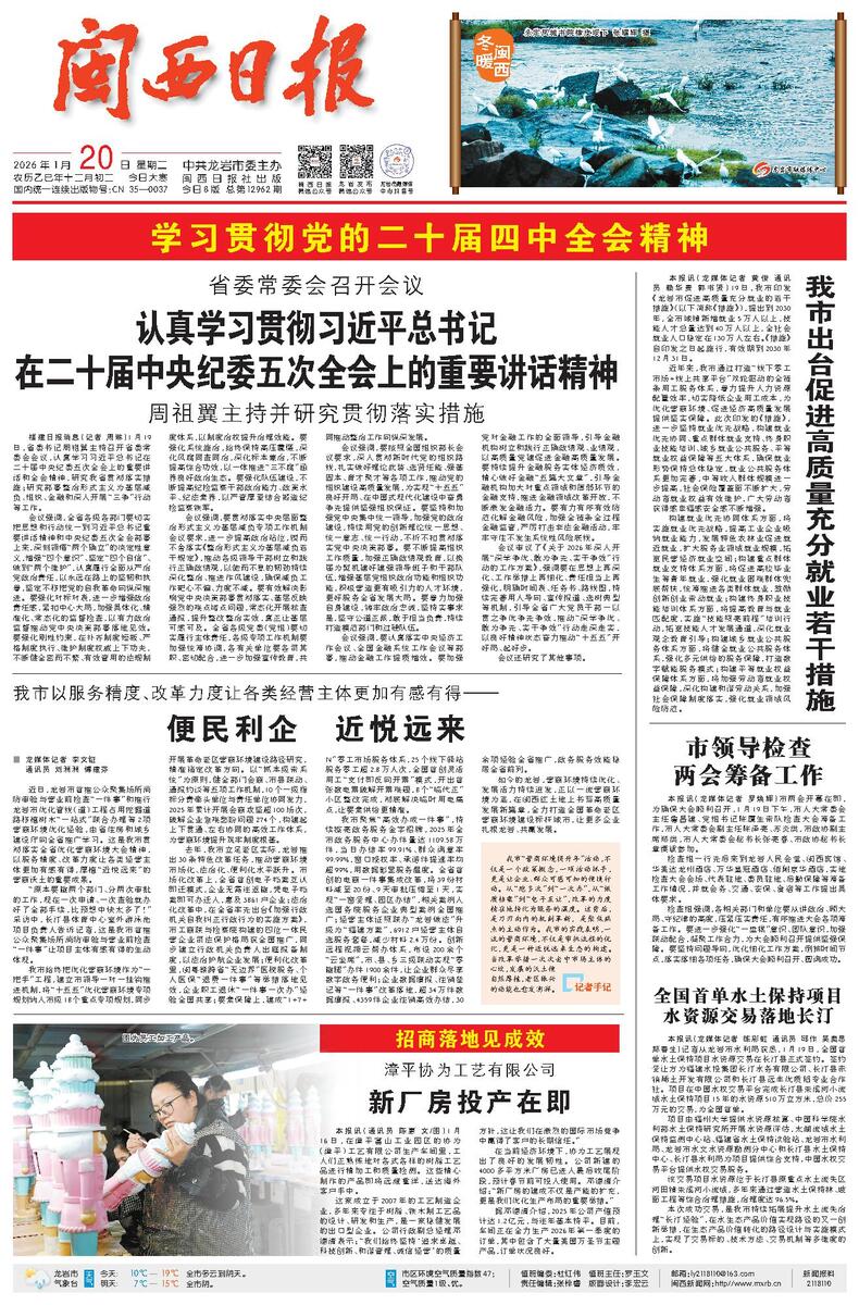 本报讯(龙媒体记者 练彩虹 通讯员 邱作 吴奥思 郑春生)记者从龙岩市水利局获悉,1月19日,全国首单水土保持项目水资源交易在长汀县正式签约。签约受让方为福建水投集团长汀水务有限公司、长汀县赤铕稀土开发有限公司和长汀县远丰优质稻专业合作社。项目在中国水权交易平台完成长汀县朱溪河小流域水土保持项目15年的水资源510万立方米,总价255万元的交易,为全国首单。