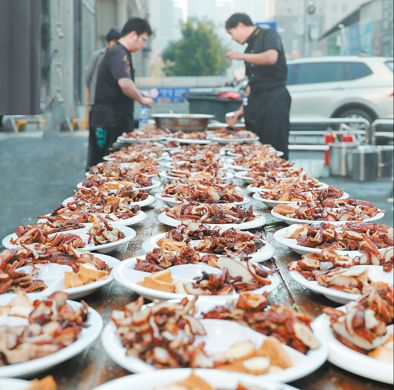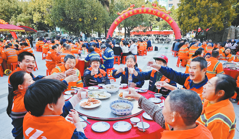 1月18日中午,中心城区世纪天成北广场上,来自新罗区西陂辖区的300多位环卫工人欢聚在一起,参加了爱心人士和爱心企业主办的“请城市美容师吃杀猪宴”活动。自媒体达人发动龙岩多家爱心企业、单位出钱出力,举办杀猪宴,送上新年礼物。同时,爱心人士还现场提供义务理发等服务,他们的爱心善举受到广大市民的广泛好评。龙媒体记者 赖珊盛 摄