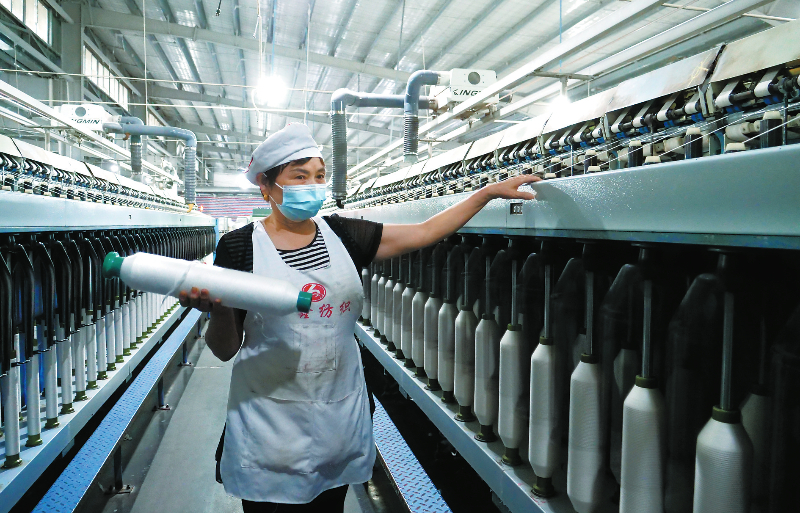 近日,福建宏鑫纺织有限公司生产车间内,工人正在操作半自动纺纱机生产产品。得益于长汀县推动优势产业集群化、高端化、绿色化发展的政策,该企业发展稳健。近年来,长汀县优质企业培育梯队持续壮大,去年完成纺织服装产业产值及其贸易额55亿元。 通讯员 陈炳林 沈元兴 黄俊齐 摄