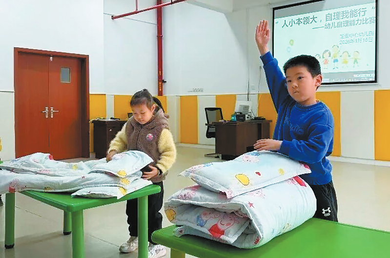 近日,连城县庙前镇芷溪中心幼儿园举办“自理小能手,快乐显身手”幼儿自理能力比赛活动。随着一声指令,小选手们迅速投入比拼,一双双小手熟练地整理着被子,铺平、折叠、压实、整形,动作娴熟,每一个操作步骤都有条不紊、有模有样,衣服按顺序对齐对折整齐规范,充分展现了良好的自理能力。 通讯员 邹善水 连妙玉 摄