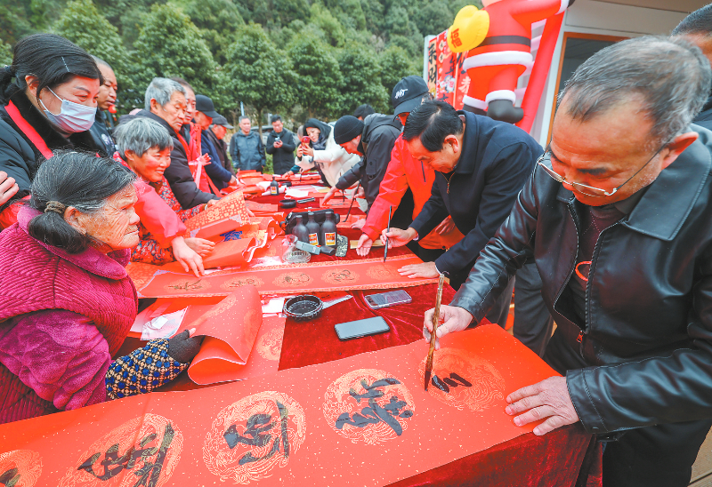 这是2月1日在莲花镇年俗文化活动现场拍摄的写春联送福字活动。当日,浙江省建德市莲花镇年俗文化活动在戴家村火热开场,当地百姓与外地游客逛年味市集、看乡土画展、玩传统游戏、吃乡村百家宴,体验迎新春乡土文化盛宴。 新华社记者 徐昱 摄