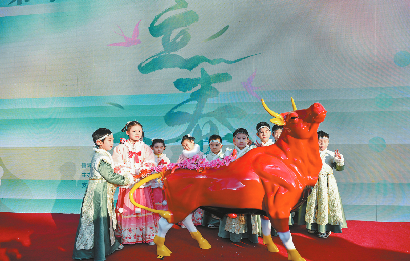 2月4日,“春姑娘”“牛童”手持花枝鞭打春牛。2月4日是立春,北京市东城区建国门街道第十九届立春文化活动在北京古观象台举行。文化活动重点展示立春时节“打春牛”等传统民俗。 新华社记者 李鑫 摄