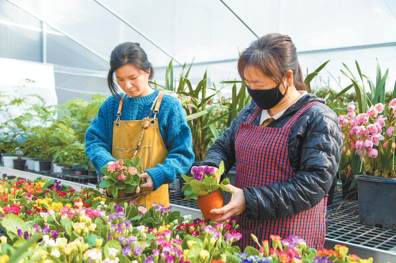 图为紫安花卉产业园的两名员工在大棚内整枝组盆,准备送往已下单的客户。