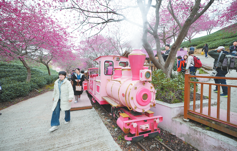 图为游客在体验台品樱花园游玩项目“小火车”。 龙媒体记者 章宸睿 摄
