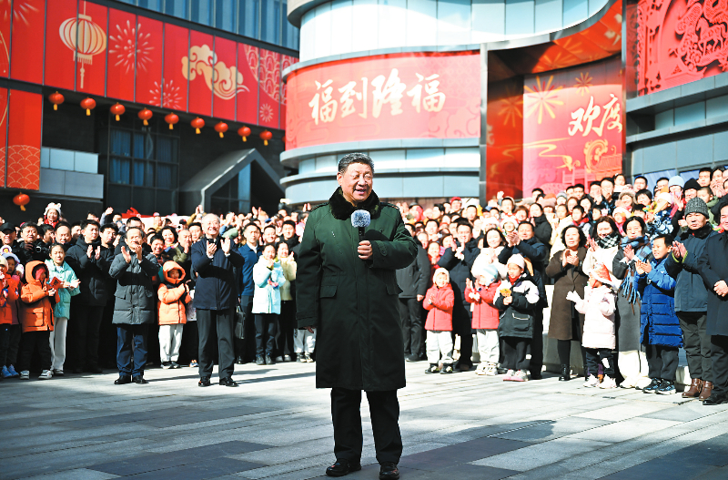 这是10日上午,习近平在东城区隆福寺街区考察时,向全国各族人民和香港同胞、澳门同胞、台湾同胞、海外侨胞致以美好的新春祝福。 新华社记者 燕雁 摄