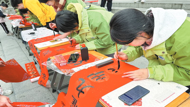 2月9日,长汀一中组织开展“墨香迎新春 志愿送福来——我们的节日·春节”主题志愿活动,来自该校的学子,在校门口义务为市民写“福”字。通讯员 林加涛 摄