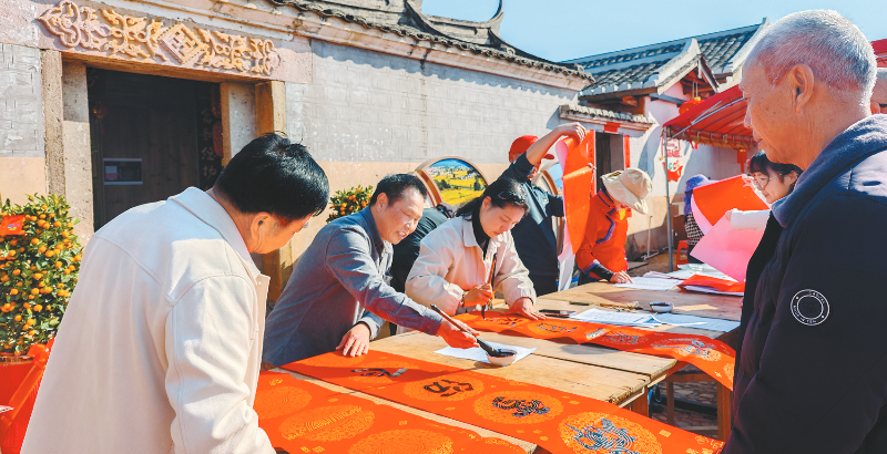 近日,上杭县庐丰畲族乡在麻子坝围屋文化会客厅举办“马跃新程 福满畲乡”迎新春主题活动,通过写春联、送福字、杀年猪、品年宴等传统习俗,为当地群众营造出喜庆祥和的节日氛围。通讯员 林燕萍 张聪聪 摄