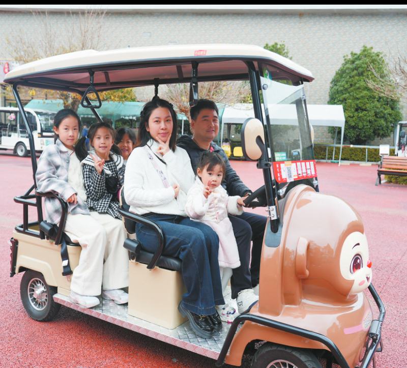 图为一家人有序乘坐电瓶车观赏千鹭湖景区。
