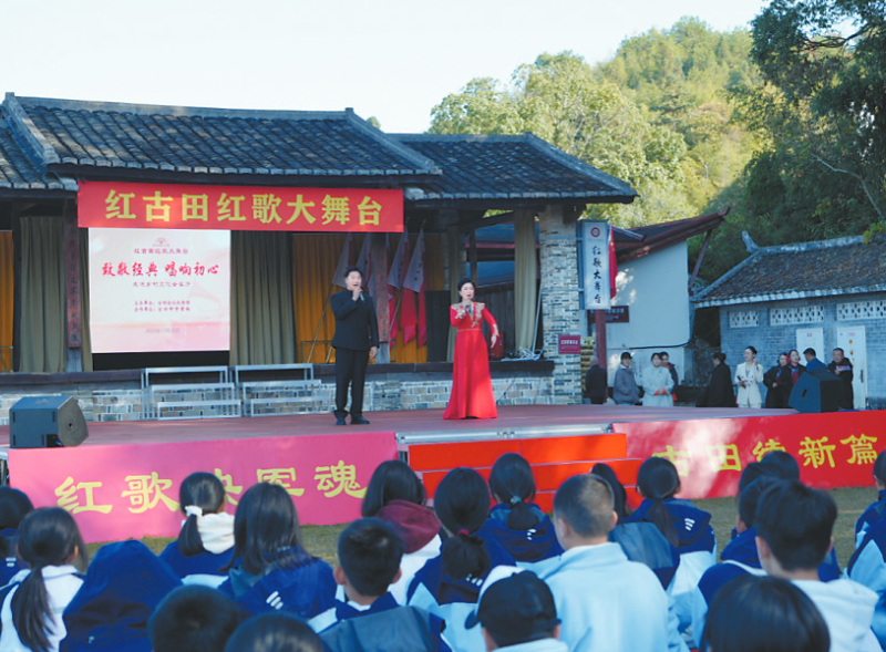 红古田红歌大舞台自创办以来,始终坚守以人民为中心的发展思想,免费对所有游客开放,让广大人民群众共享红色文化发展成果。众多艺术家和参演者怀着对革命圣地的崇敬之情,积极投身红歌大舞台的演出,不计报酬,无私奉献。这一举措也吸引了大量民间艺术家的热情参与,许多游客也踊跃登台,即兴表演,唱出心中对党的无限热爱和对美好生活的真挚赞颂。古田会议纪念馆更将红古田红歌大舞台打造成为“大思政课”教育的创新平台,与古田中小学研学营地紧密合作,在演出间隙巧妙穿插古田会议相关知识的互动问答环节,使观众在寓教于乐中重温峥嵘岁月,铭记历史,传承红色精神。2025年度,该平台已使近万名学子从中受益,成为培育时代新人、弘扬社会主义核心价值观的生动课堂。