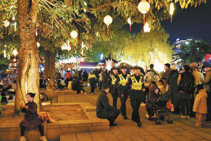 “群众赏景,民警站岗”2月22日晚,烟花秀点燃汀州古城夜空,长汀公安民警强化景区巡逻防控,确保活动安全有序。