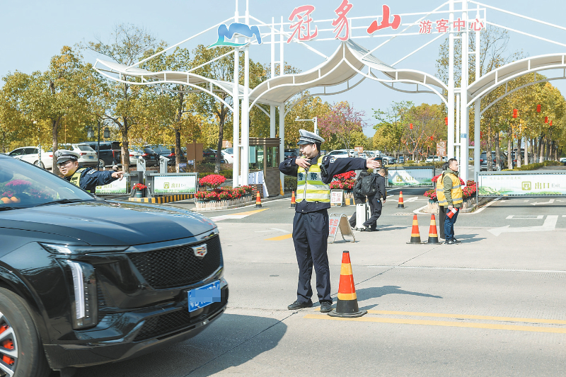 春节假期,连城交警在冠豸山游客中心门口全力疏导车流,为景区旅游出行保驾护航。