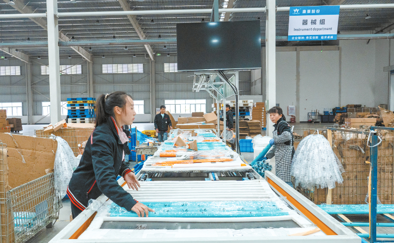 昨日,在连城工业园区的福建康莱宝运动用品有限公司生产车间,工人们正有序操作包装,一件件健身器材成品整齐排列、即将装货发车。车间内、生产线上处处洋溢着抢工期、赶订单、忙生产的火热景象。 通讯员 黄水林 摄