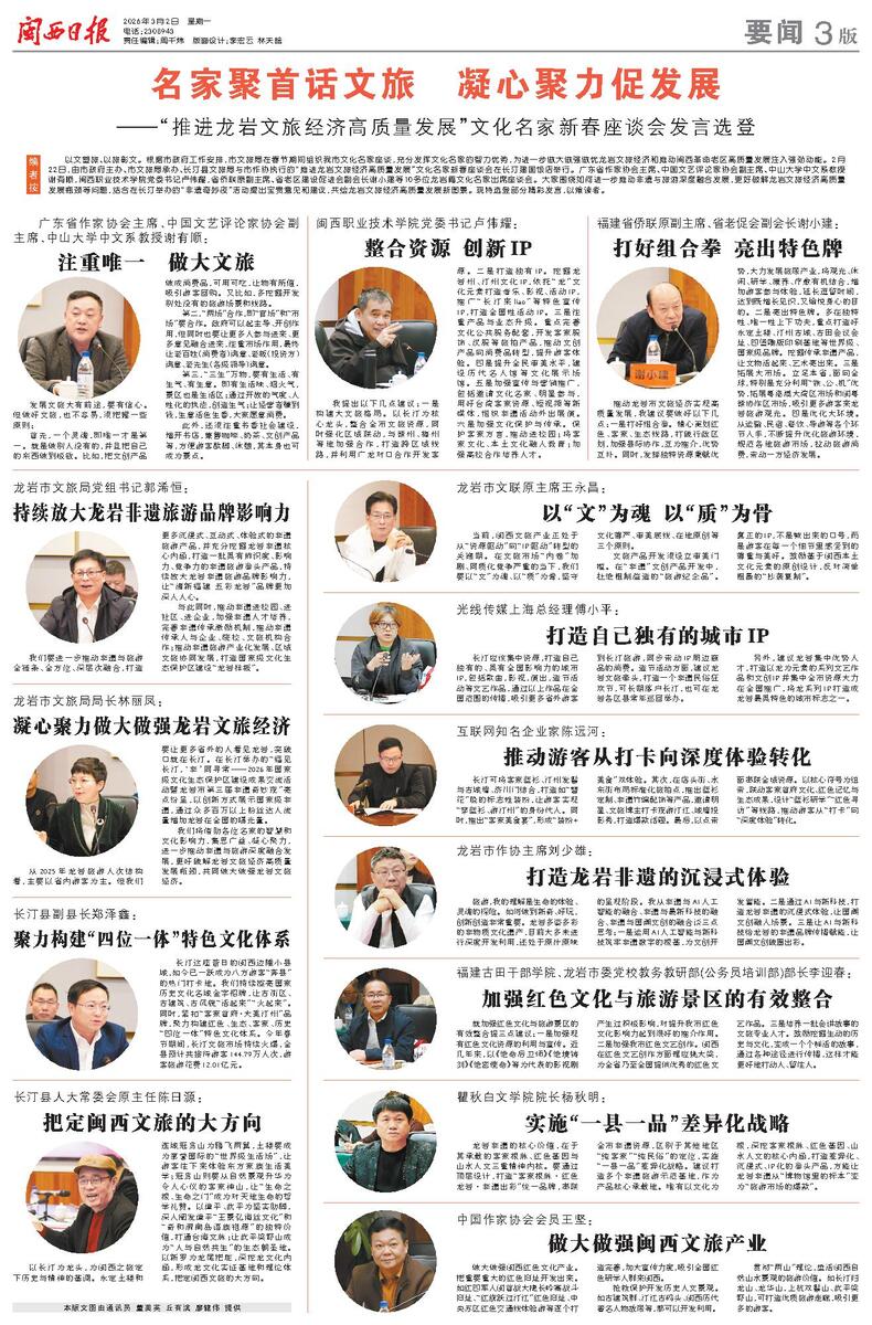 我提出以下几点建议:一是构建大文旅格局。以长汀为核心龙头,整合全市文旅资源,同时强化区域联动,与赣州、梅州等地加强合作,打造跨区域线路,并利用广龙对口合作开发客源。二是打造独有IP。挖掘龙岩州、汀州文化IP,依托“龙”文化元素打造音乐、影视、活动IP,推广“长汀来liao”等特色宣传IP,打造全国性活动IP。三是注重产品与业态升级。重点完善文化公共服务配套,开发客家服饰、汉服等旅拍产品,推动文创产品向消费品转型,提升游客体验。四是提升全民审美水平,建设历代名人馆等文化展示场馆。五是加强宣传与营销推广,包括邀请文化名家、明星参与,用好台湾客家资源、短视频等新媒体,组织非遗活动外出展演。六是加强文化保护与传承。保护客家方言,推动进校园;将客家文化、本土文化融入教育;加强高校合作培养人才。