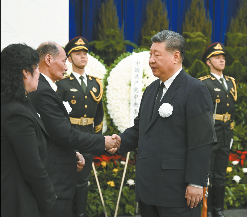 3月10日,宋平同志遗体在北京八宝山革命公墓火化。习近平、李强、赵乐际、王沪宁、蔡奇、丁薛祥、李希、韩正等前往八宝山送别,胡锦涛送花圈表示哀悼。这是习近平与宋平亲属握手,表示深切慰问。 新华社记者 谢环驰 摄