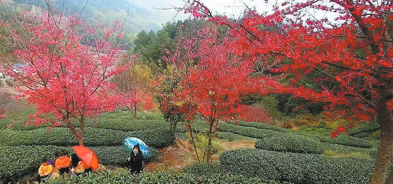 近日,游客正在连城赖源乡千亩茶园里欣赏盛开的樱花。春日里,赖源千亩茶园樱花盛放,绿茶红樱相映成趣,吸引了不少踏春赏花的游人。 通讯员 邹善水 陈基鸿 摄