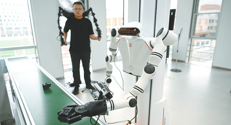 3月17日,在中国雄安集团数字城市科技有限公司具身智能训练场,工作人员对机器人进行具身智能训练。日前,中国雄安集团数字城市科技有限公司具身智能训练场正式投入使用,该训练场采用1∶1实景还原,打造了机器人迎宾导览、工业搬运、家居生活、商业零售、物流装配五大真实场景,开展常态化真机数据采集与标注,收集到的数据向社会开放,助推具身智能技术在城市复杂场景中的规模化应用与商业化落地。新华社记者 朱旭东 摄