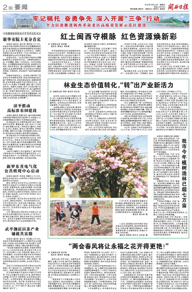 今年年初,我市出台《龙岩市关于加快推动林业产业高质量发展三年(2026-2028年)行动方案》,构建“853”林业产业发展体系,通过发展八大林业主导产业、大力实施五大强基工程、建立健全三大绿色产业发展机制,打造高效生态绿色产业集群。站在新的起点,龙岩林业改革发展将继续深化,持续写好“长汀经验”“武平经验”两张生态答卷,推动林业生态价值转化不断走深走实。
