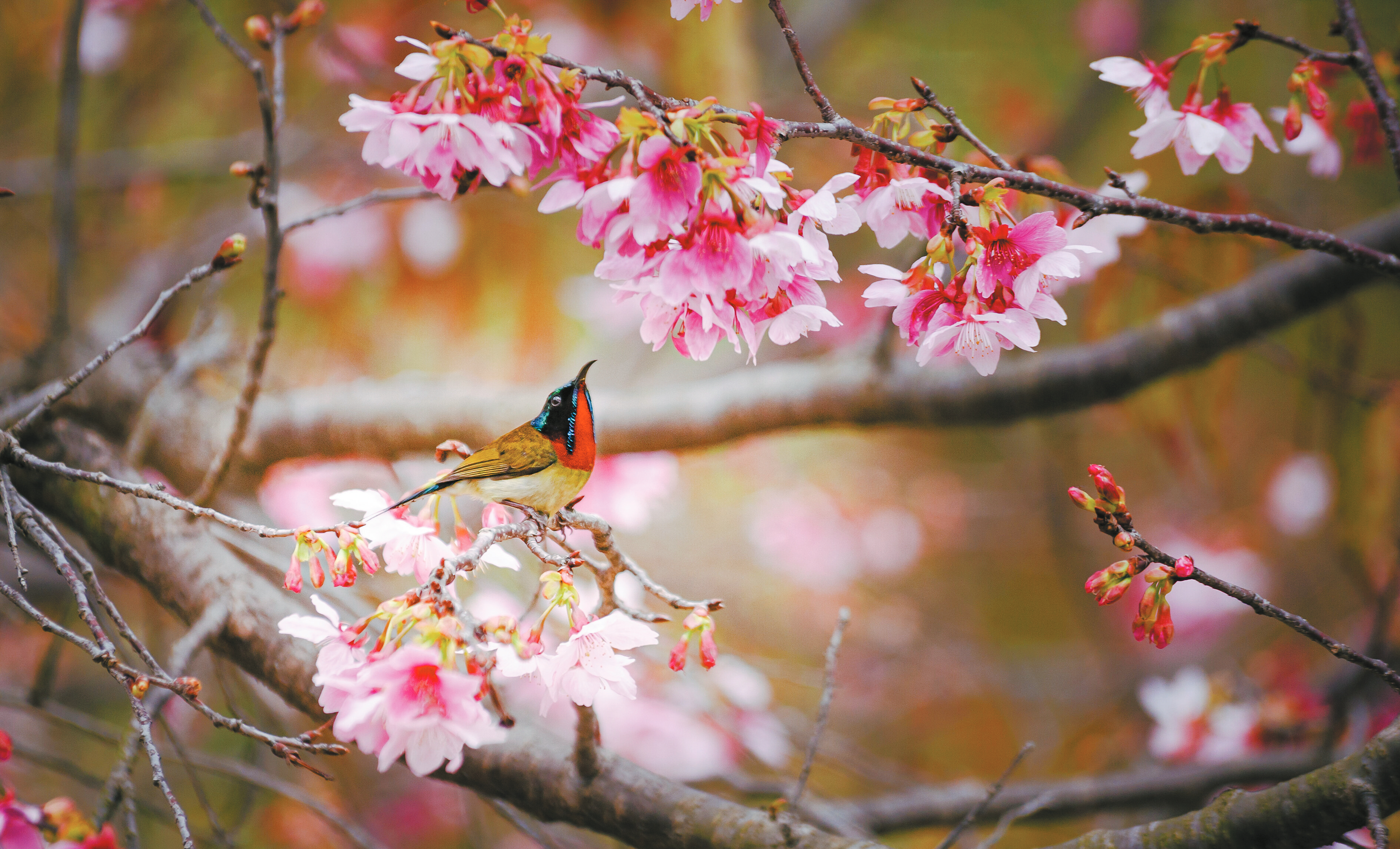 上杭县罗星塔公园,粉樱绽放,鸟儿在枝头“歌唱”。