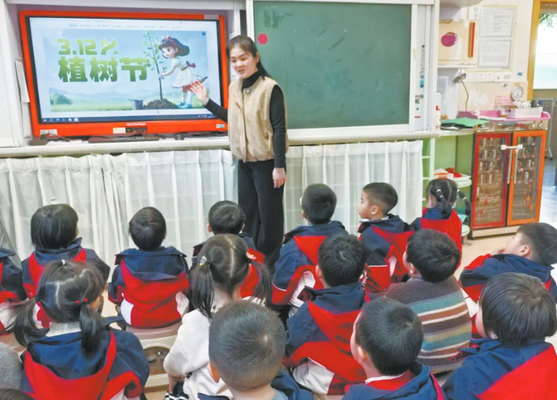 近日,龙岩市实验幼儿园开展了“植绿护绿 童心向春”主题活动,以童趣方式播种绿色、拥抱春天,小班老师开启“绿色小课堂”,通过生动的故事、形象的图片,向孩子们讲解植树节的由来与重要意义。龙媒体记者 杨燕 通讯员 章颖 摄