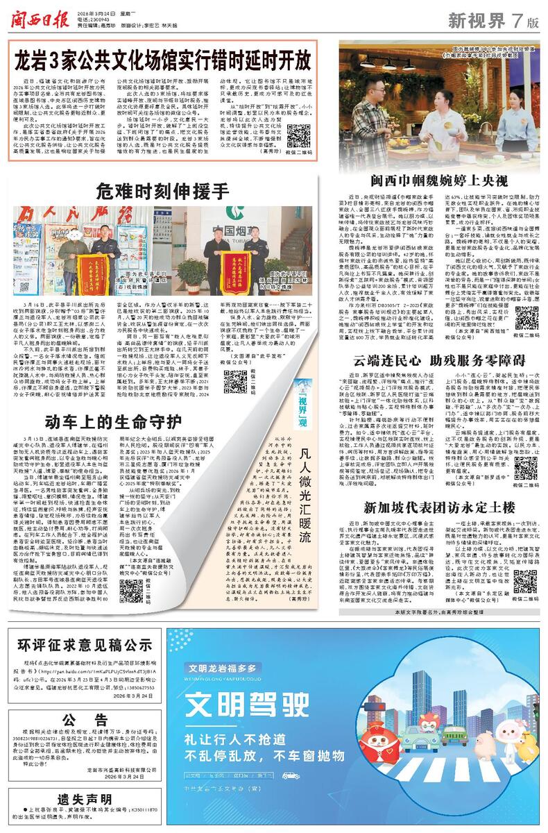 场馆延时一小步,文化惠民一大步。错时延时开放,破解了“上班没空逛、下班闭馆了”的痛点,把文化服务送到群众最需要的时段。龙岩3家场馆的入选,既是对公共文化服务提质增效的有力推进,也是民生温度的生动体现。它让图书馆不只是城市地标,更成为深夜书香驿站;让博物馆不只承载历史,更成为可感可及的红色课堂。