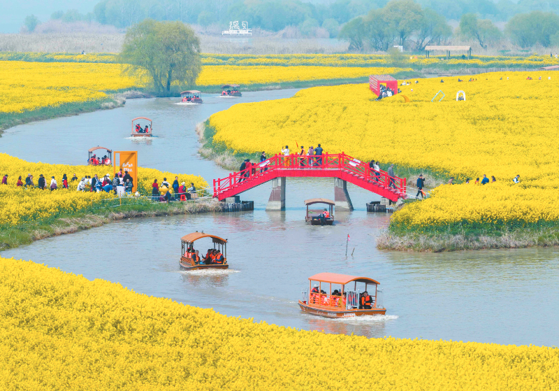 3月28日,游客在江苏省高邮市湖上花海景区赏花游玩。随着气温回升,各地景美如画,神州大地春色满满。 新华社发 周社根 摄