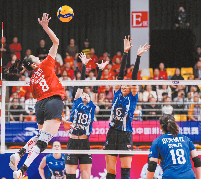 3月28日,江苏中天钢铁队球员吴梦洁(左一)在比赛中扣球。当日 ,在 2025-2026赛季中国女子排球超级联赛总决赛冠亚军决赛首回合比赛中,江苏中天钢铁队主场3比0战胜上海光明优倍队。新华社记者 李博 摄