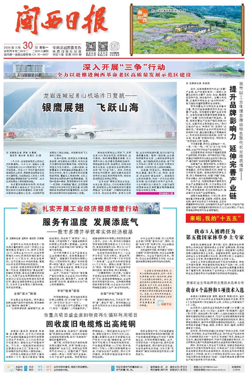 空港通,则百业兴。便捷高效的航空通道,是汇聚人流、物流、信息流、资金流的“黄金纽带”。连城冠豸山机场的复航,将进一步优化区域投资环境,助力招商引资和产业升级,为乡村振兴注入新活力,为奋力谱写闽西革命老区高质量发展新篇章提供坚实的航空支撑。