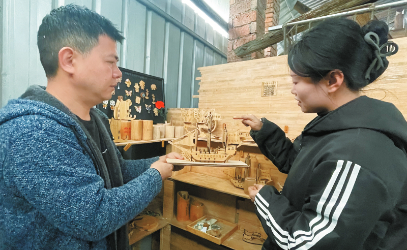 短短一年多时间,便有50多款竹工艺文创产品从冯田村走向市场,帆船、白塔、平衡鸟、按摩梳、冰箱贴、米奇摆件、木屋拼图版、小木马拼图、竹包包、竹音箱等琳琅满目。目前,公司年销售额已达200多万元。