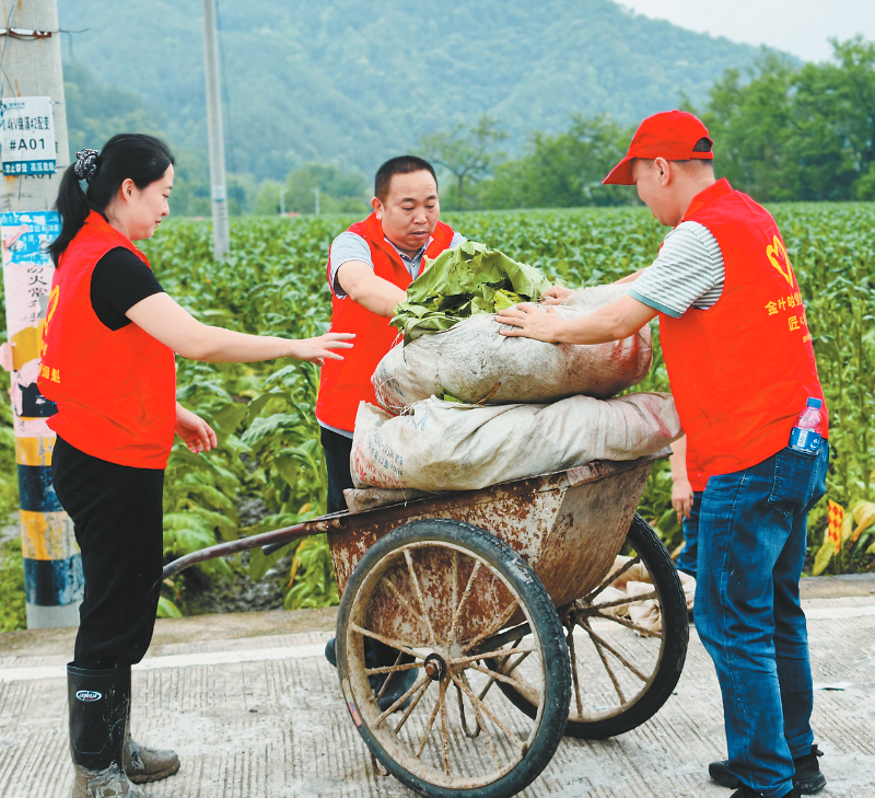 图为党员志愿者在帮助烟农收拾雨毁烟叶。