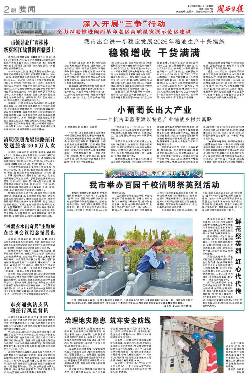 本报讯(龙媒体记者 刘菲菲 通讯员 刘鑫根)4月2日,记者从龙岩车务段获悉,2026年“清明”运输期限为 4月3日至4月7日,共5天,清明假期龙岩铁路预计发送旅客 20.5万人次(日均4.1万人次),预计客流高峰日为4月6日,发送旅客5.1万人次。