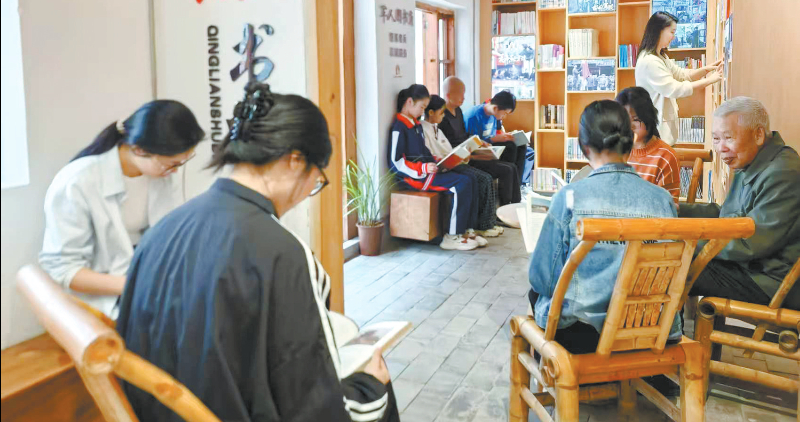 培田村老人、学生专心阅读单霁翔捐赠的著作
